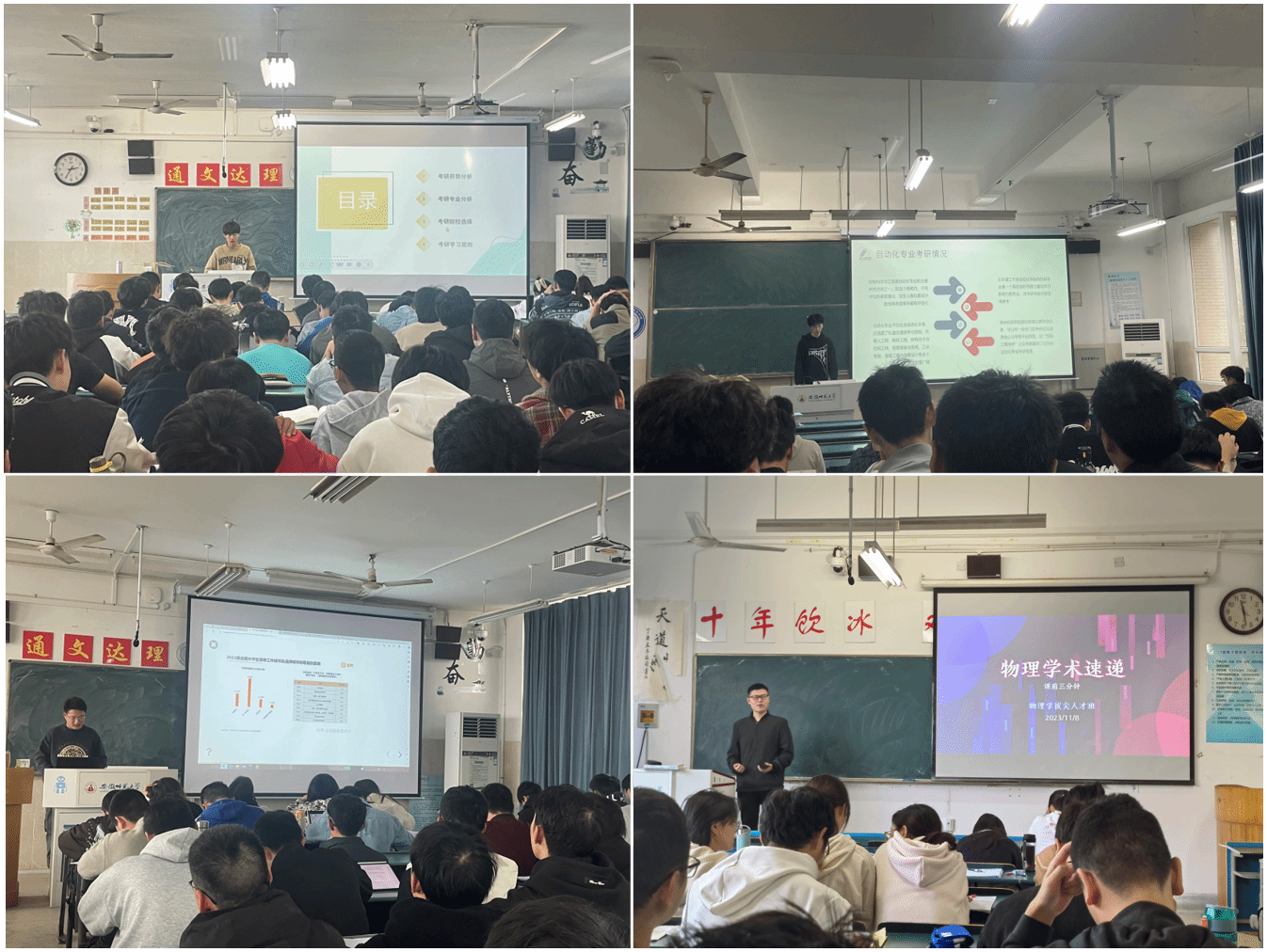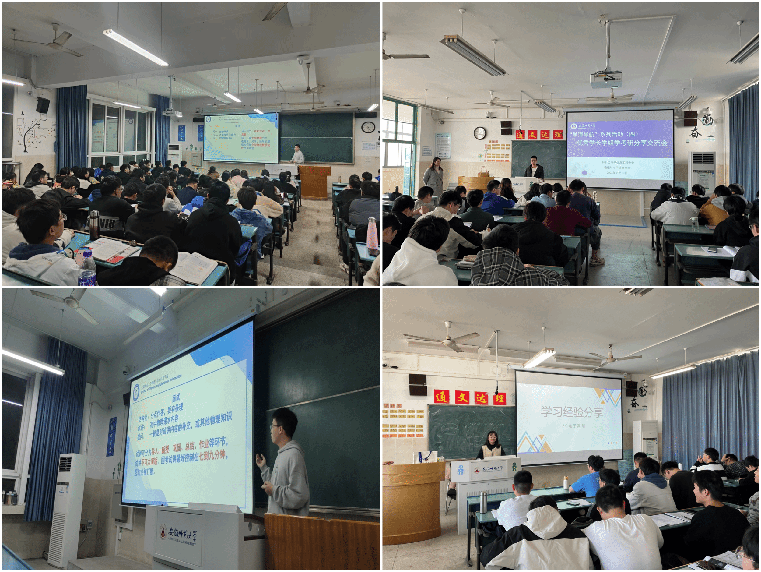 的五大科研平台,根据学生的兴趣将全体学生分流到各个科研平台,通过参加科研平台组会和系列学术讲座,引导学生深入体验科研的魅力,拓宽学术视野,培养学生创新精神;经验分享长才干,2021级物理学(师范)班邀请2018级物电学子与2020级物理(师范)同学进班分享考研和教师资格证考试备考经验,讲述教资备考和考研择校方法,推荐备考资料,理清考研误区,传授教资面试技能,为后续考研和考证夯实专业技能。