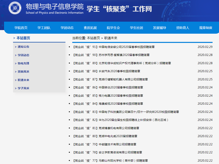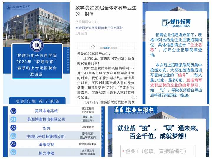 快应对,实现“招上网来”。受疫情影响,今年学院将原定3月6日举办的就业联盟峰会和“职”通未来春季现场招聘会特改为线上招聘形式进行。2月13日,学院发布线上专场招聘会企业邀请函;16日,拟定《致学院2020届全体本科毕业生的一封信》;17日-22日,审核用人单位报名材料,逐一发布企业招聘简章至院学工网就业专栏;25日,发布“职”通未来战疫征集令,供学生查阅、报名;3月1日,学生求职简历集中投递至用人单位;3月5日-10日,举办集中线上视频招聘宣讲。