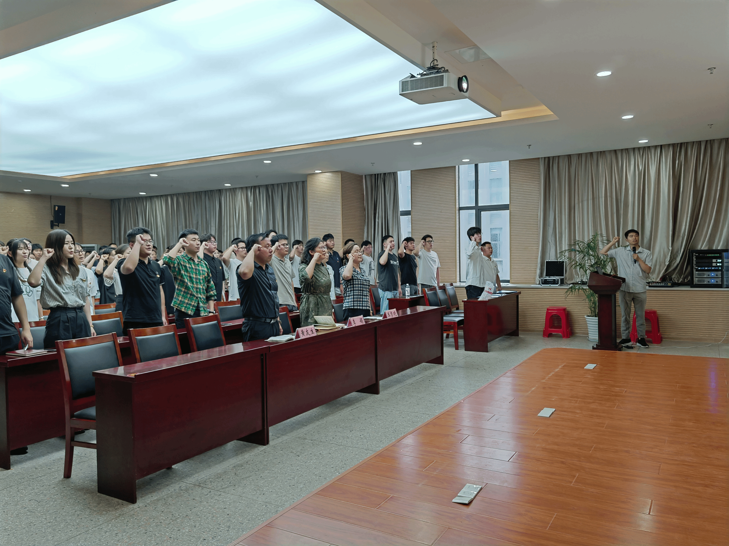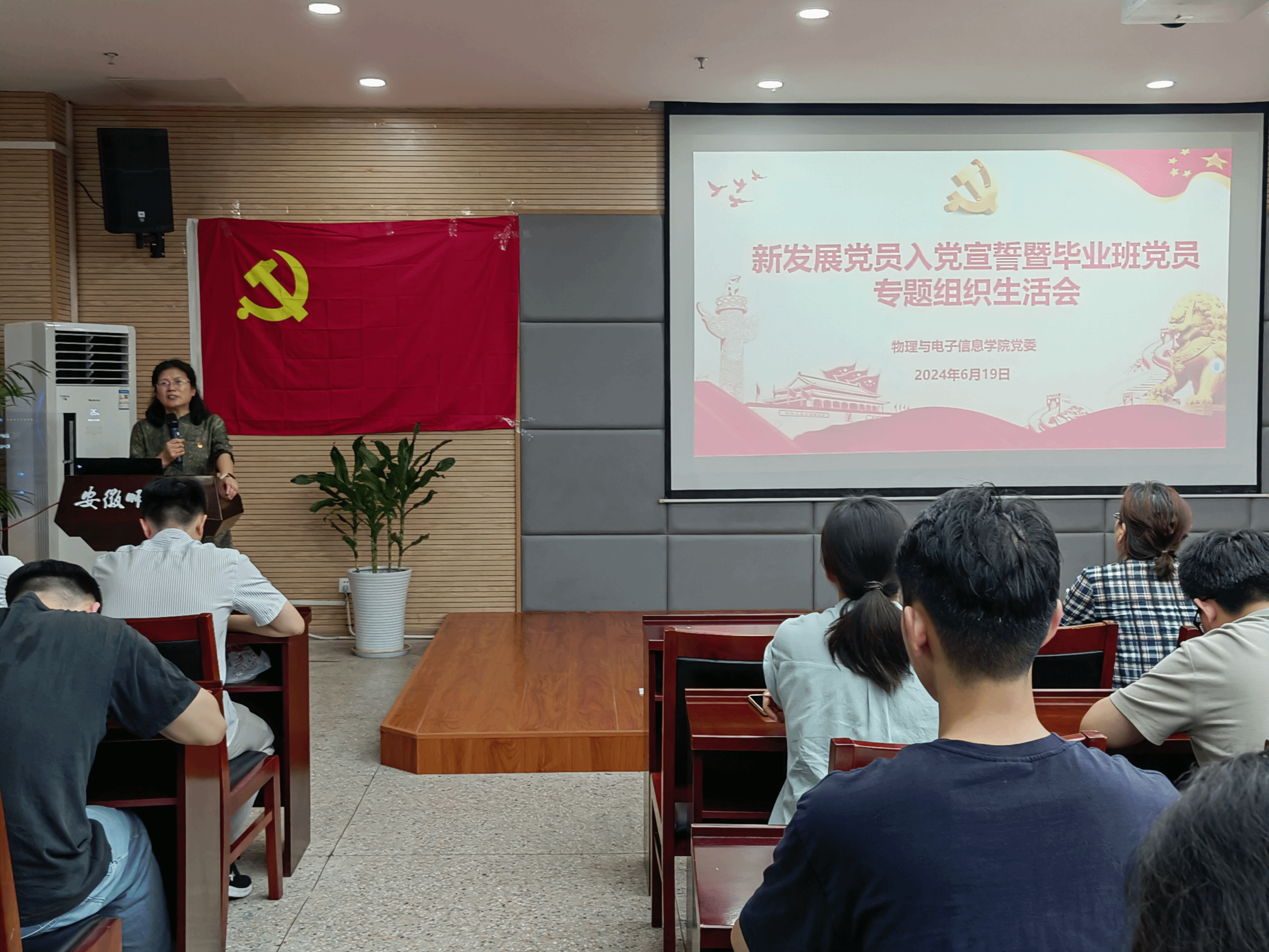 于物理楼 304 会议室举办新发展党员入党宣誓暨毕业班党员专题组织生活会。学院党委书记李娟、党委副书记黄友生、组织员王梦晓、各学生党支部书记、2024届毕业班辅导员、全体毕业班党员及新发展党员参会,会议由物理学本科生党支部书记曹阳主持。