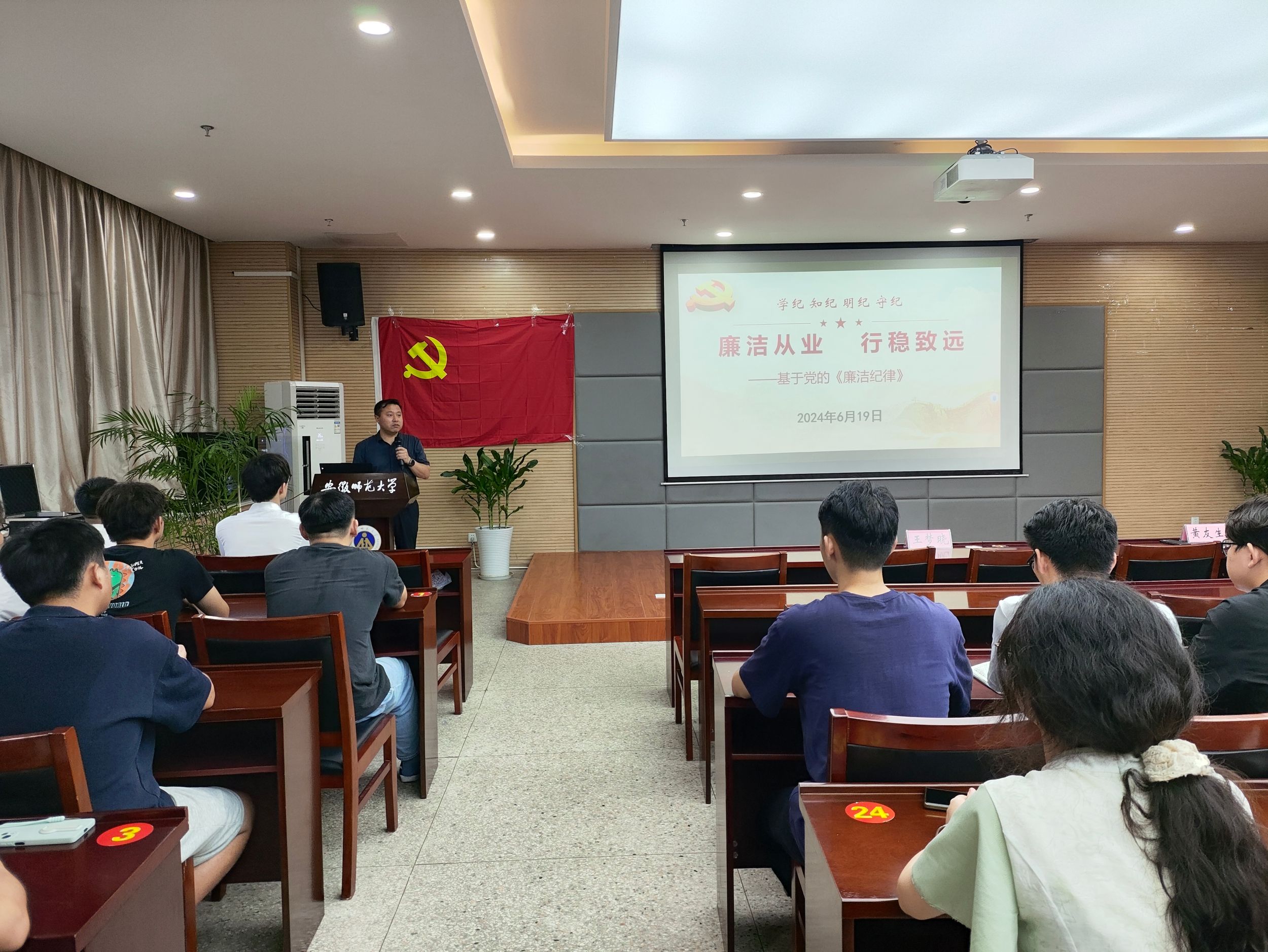 黄友生以“廉洁从业,行稳致远”为题,给毕业班学生党员及新发展党员讲授党纪学习教育专题党课。他强调党纪学习教育要做到学纪、知纪、明纪、守纪。一是要笃学笃行,爱党敬业,廉洁从业,在工作中坚守职责,为党和人民的事业贡献力量;二是要慎独慎微,涵养廉洁品德,培养高尚的道德情操;三是要有尺有度,以实干求发展,坚守廉洁本色。黄友生强调成功是靠自己奋斗出来的,希望大家在新的征程中坚守廉洁初心,行稳致远,创造属于自己的美好明天。