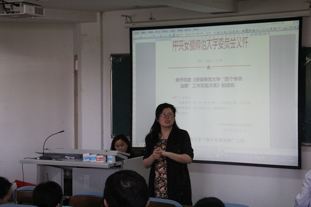 院党委书记李娟首先传达了学校“四个专项治理”工作布置会议精神,带领大家学习了《安徽师范大学“四个专项治理”工作实施方案》,详细介绍了“四个专项治理”的范围、内容、方法步骤和责任主体等。对学院开展“小金库”专项治理“回头看”、“科研经费规范管理专项治理”和“师德师风专项治理工作”进行部署,要求全体教师高度重视,认真对照文件,实事求是,做好各个专项治理的自查自纠工作,并及时上报学院,确保专项治理工作扎实推进。会上,李娟还对组织开展全国高校思想政治工作会议精神在线知识测试工作进行布置。
