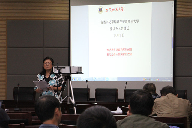 李娟首先领学了《省委书记李锦斌在安徽师范大学调研座谈会上的讲话》,并传达了李锦斌书记对我校近年来改革发展成就的高度评价和殷切期望。她强调,全体教职工要认真贯彻学习李锦斌书记视察我校讲话精神,全面准确把握讲话精神实质,充分认清推动教育资源向基层倾斜的重要性,切实拓宽教育资源向基层倾斜的基本途径,强化教育资源向基层倾斜的政策引导。会上,她还强调了校园安全稳定工作,从交通安全、网络安全、实验室安全等方面提出了要求,确保以安全稳定的校园环境迎接党的十九大胜利召开。