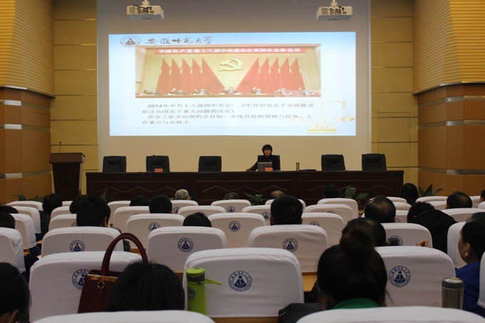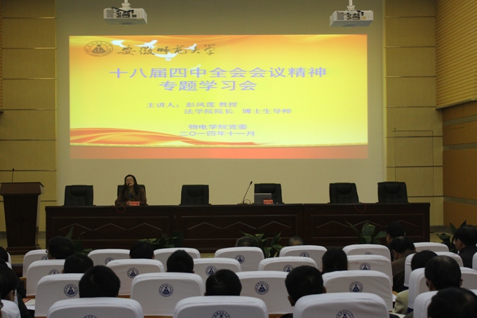 在赭山校区科技楼小礼堂组织召开了十八届四中全会会议精神专题学习会,特邀请法学院院长、博士生导师彭凤莲教授做专题讲座。全体教职工、退休支部委员、学生党员、学生入党积极分子参加会议。会议由院党委书记李娟主持。