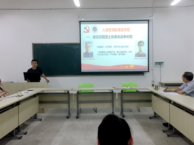 保持党的纯洁性,先进性应从我们这一代做起。紧接着李子旻给到场的所有党员讲了一次题为“入党誓词的演变历程”的党课,带领党员同志们一起重温了入党誓词,加深了党员同志对入党誓词演变历程的了解和其内涵的理解。并在张佳丽的领誓之下,全体党员一同宣誓,重温了入党誓词。