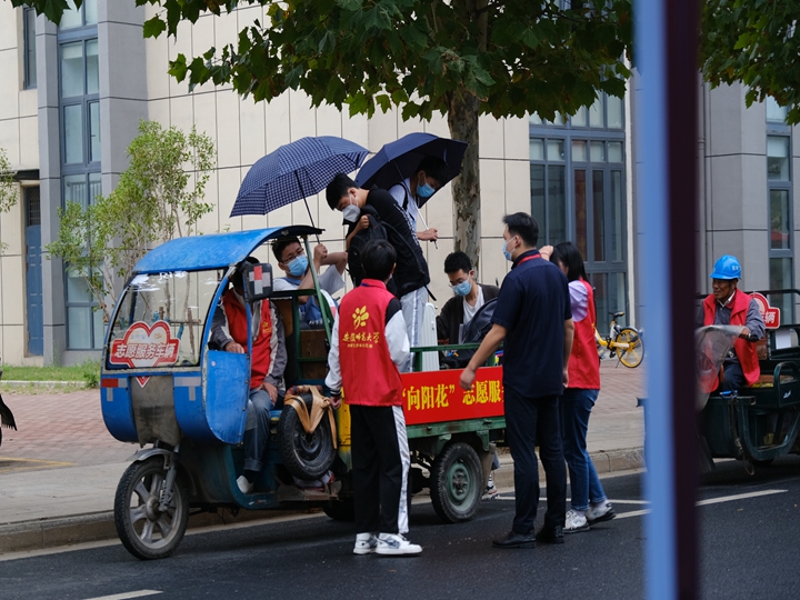 安排党员先锋负责校园内大巴车接送点引导工作。“新生来了,快去帮忙!”一辆从车站载着新生的校园大巴还未停下,党员志愿者们就陆续上前,在车停下时,第一时间接过新生的行李,带领他们前往各个学院报到点。
