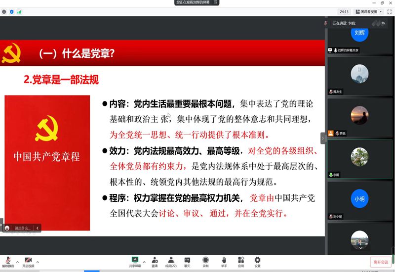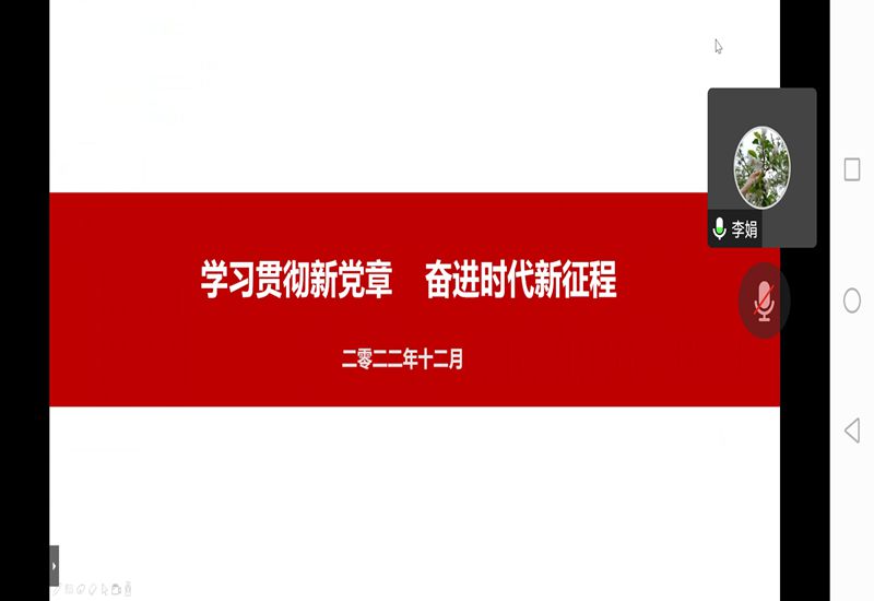 召开党委理论学习中心组(扩大)学习会,深入学习贯彻党的二十大精神,认真学习党的二十大审议通过的《中国共产党章程(修正案)》。院党委书记李娟作题为《学习贯彻新党章 奋进时代新征程》专题辅导报告。学院领导班子成员、党委委员、纪委委员、支部书记通过线上的方式参加学习会。