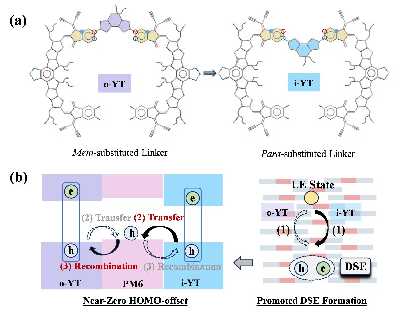 研究团队首次采用基于5,5-二辛基-5H-二噻吩并[3,2-b:2',3'-d]吡喃的不对称基团作为连接体,设计并合成了两种二聚受体o-YT和i-YT(图1),不仅有效提高了受体的能级,还对受体分子的构象实现了调控:其中,i-YT同时展现出折叠体构象和拓展构象;而o-YT中仅存在两种拓展构象。在此基础上,研究团队通过一系列具有飞秒时间分辨的瞬态吸收实验揭示:在i-YT薄膜中,定域激子(LE)可以更有效地转化为离域激子(DSE)。因此,在PM6:i-YT共混膜中,即使给体与受体分子之间的能极差几乎为零,处于离域状态的激子在给-受体界面处仍然可以高效地解离并将空穴从受体快速转移至给体,同时其电子-空穴复合速率也更慢。根据这一原理,研究团队在基于PM6:i-YT材料的光伏器件中同时获得了高达0.93 V的开路电压和超过18%的光电转化效率。不仅如此,器件稳定性也表现得更为优异:在经过1400小时持续光照后,光电转换效率依然能保持在其初始值的85%水平。
