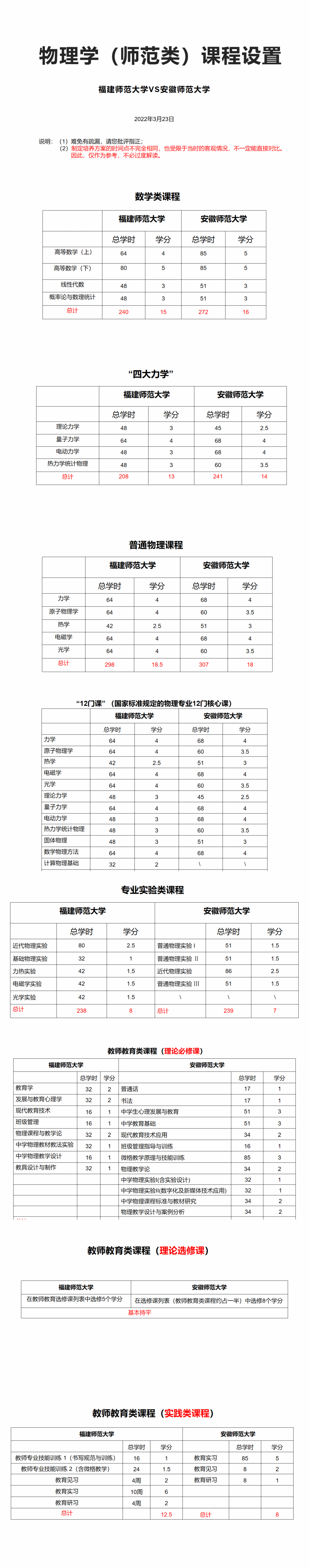 2.1福建师范大学与安徽师范大学物理(师范)培养方案对比