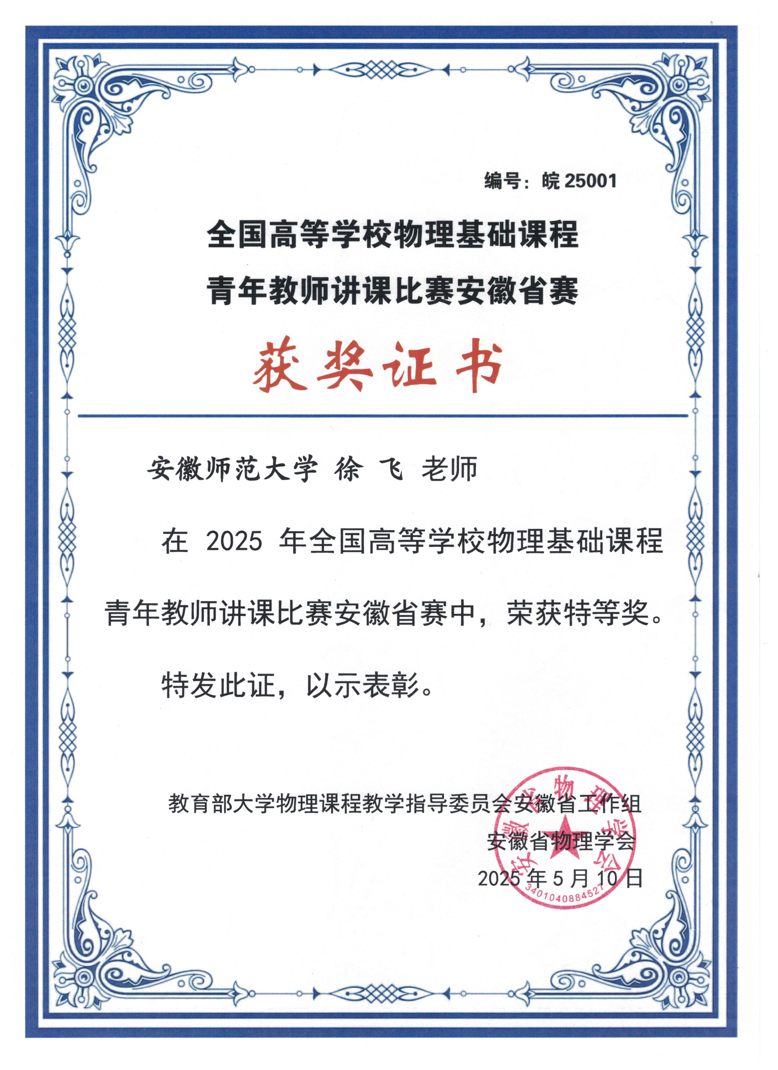 本次比赛由教育部大学物理课程教学指导委员会安徽工作委员会、安徽省物理学会共同主办,安徽大学承办。比赛汇聚了安徽省二十余所高校物理基础课程的优秀青年教师,竞争异常激烈。徐飞老师在备赛过程中,精心设计教学方案,反复打磨教学环节,力求将物理知识以生动、易懂且富有启发性的方式呈现给学生。比赛中,他以扎实的专业知识、严谨的教学态度、灵活多样的教学方法以及富有感染力的教学风格,充分展示了我校青年教师扎实的教学基本功和独特的教学风采,赢得了评委们的一致好评,最终脱颖而出,斩获特等奖第一名。